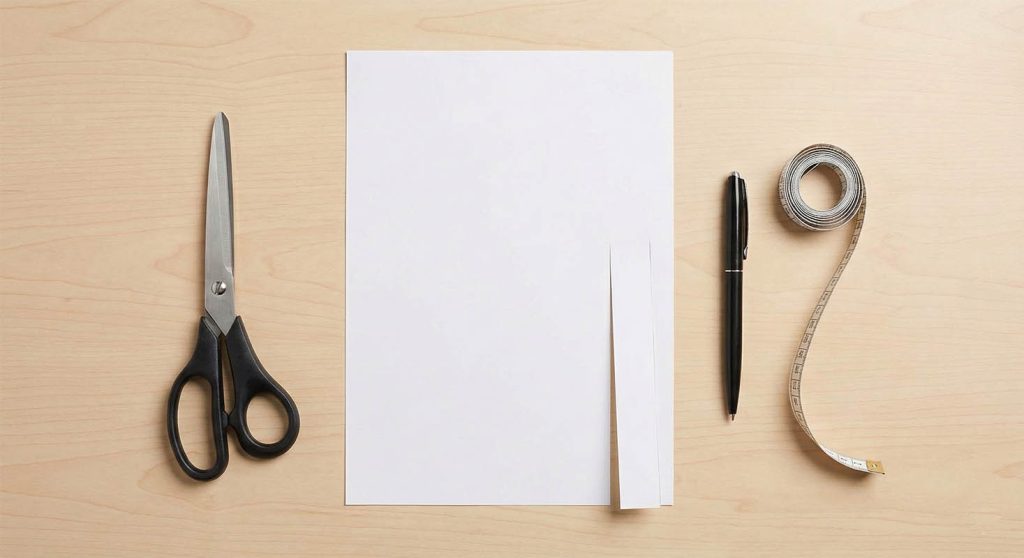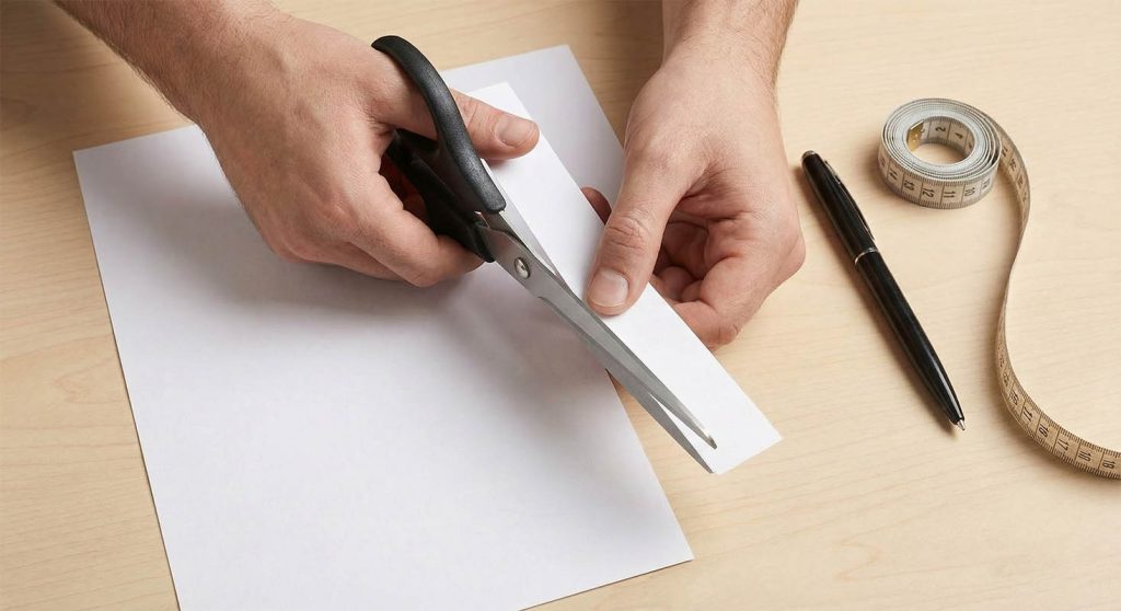 1. Prepara tu cinta de medición Toma el folio de papel y las tijeras. Corta una tira larga de aproximadamente 2 cm de ancho. No hace falta que sea perfecta, solo lo suficientemente ancha para escribir una marca sobre ella.