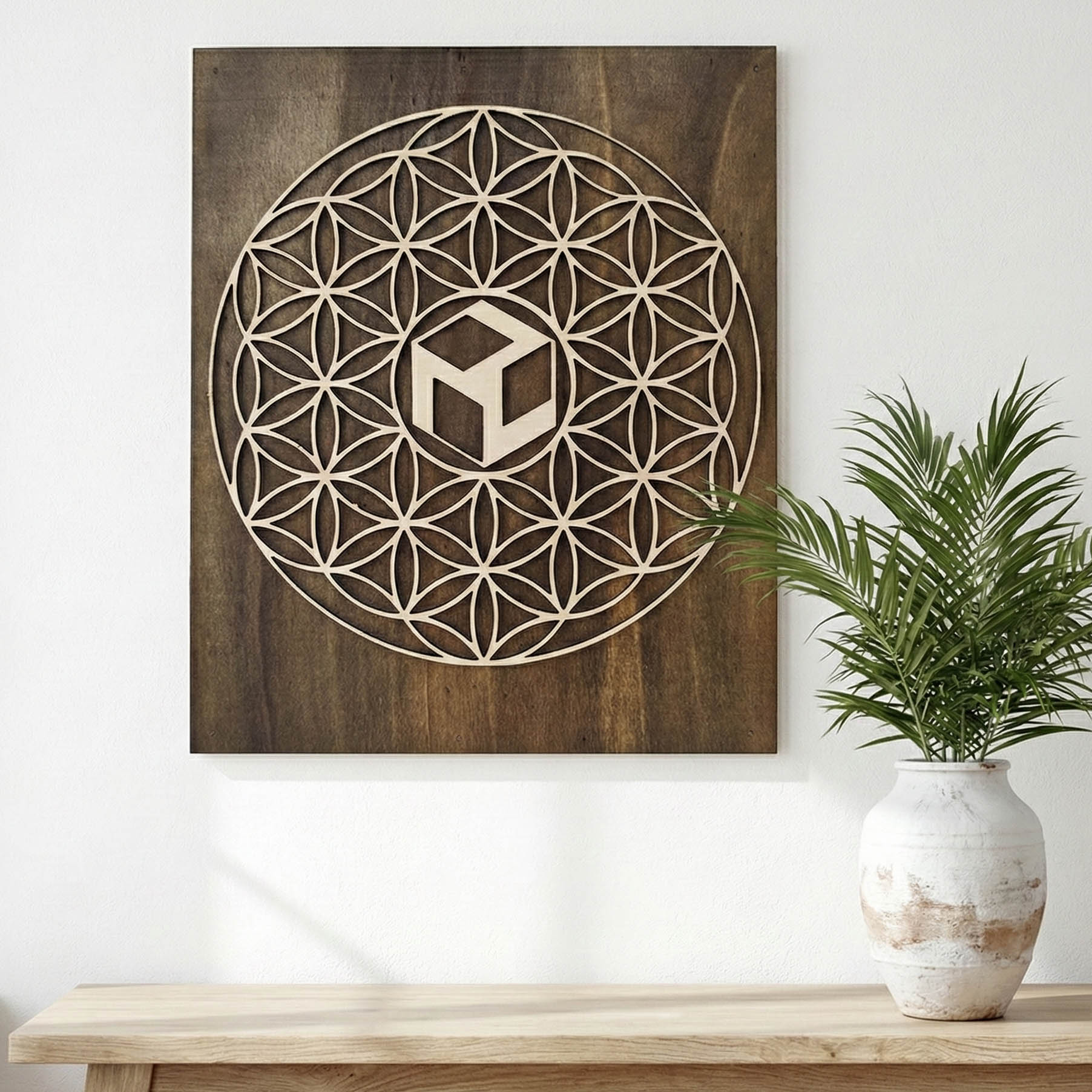 Pieza artesanal única, cortada con precisión láser en madera natural. Su diseño calado resalta la belleza de la simbología sagrada, aportando armonía y significado a cualquier espacio. Hecho por nuestro equipo con esmero, mide 40 x 30 cm y combina arte, tradición y elegancia.