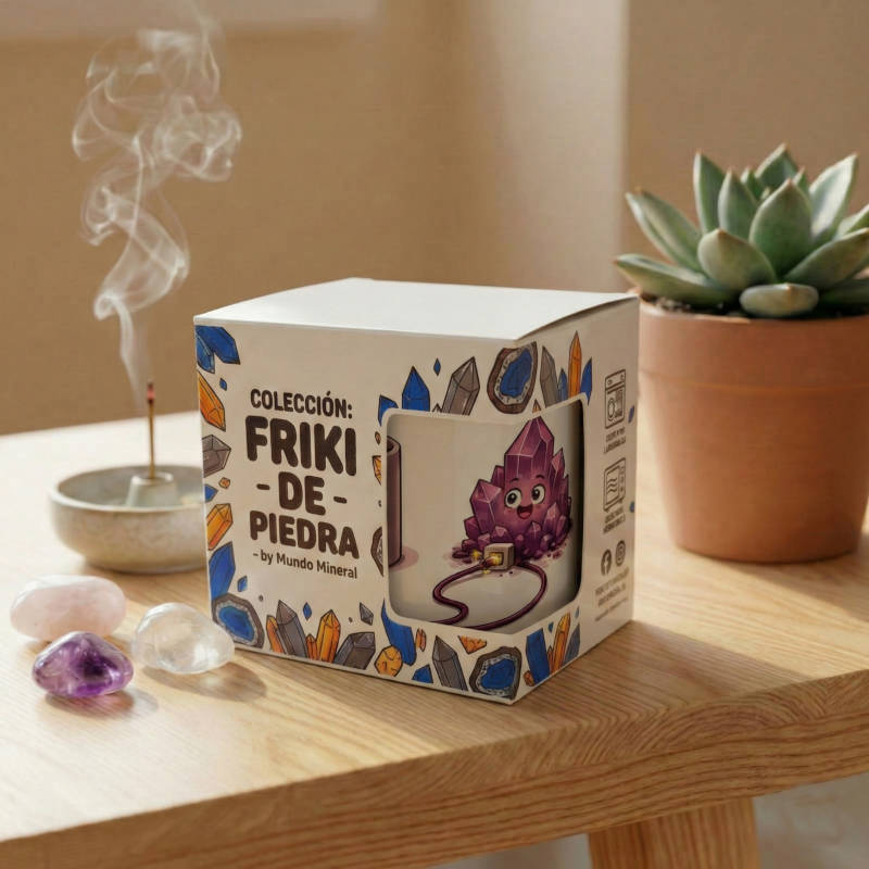 En el diseño, verás cómo una drusa de amatista (conocida por trasmutar la energía) se está poniendo las botas enchufándose directamente a una taza de café recién hecho. Porque seamos sinceros: incluso los minerales necesitan un boost de vez en cuando.