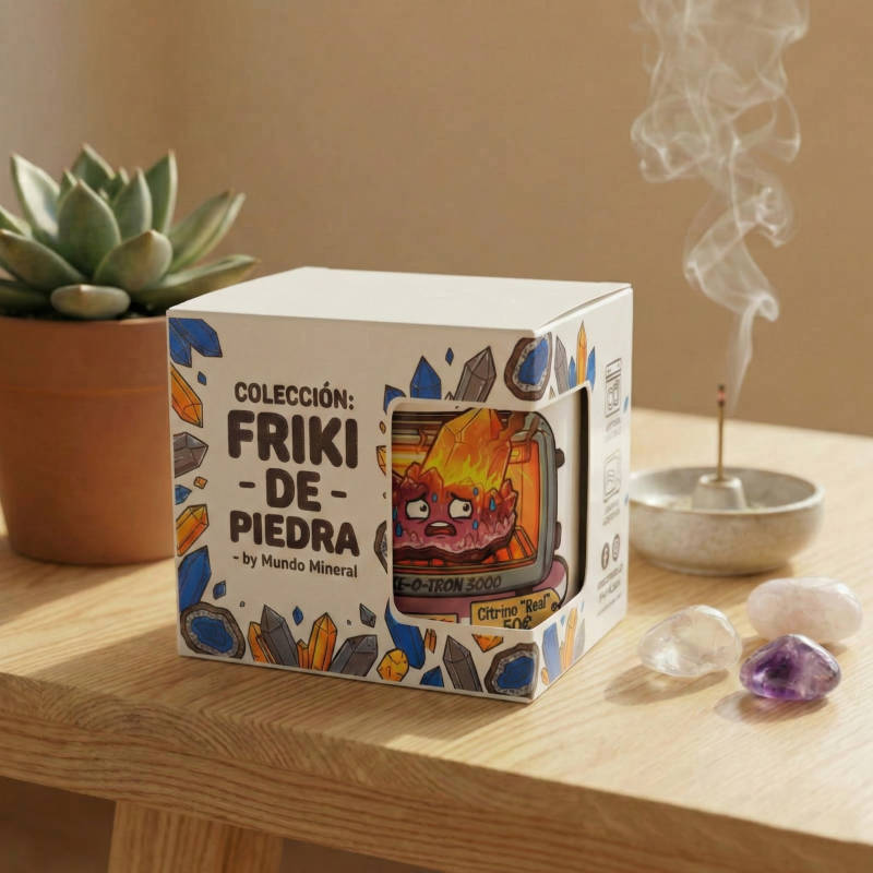 Esta taza rinde homenaje (o más bien, critica con mucho humor) al secreto peor guardado de la industria mineral: el tratamiento térmico. Nuestro diseño exclusivo presenta el “Fake-O-Tron 3000”, la máquina imaginaria donde entra una inocente amatista morada y sale un “citrino” más tostado que el pan del desayuno.