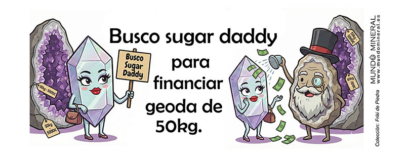 En el diseño, nuestra querida geoda ha decidido tomar medidas drásticas y buscar un Sugar Daddy para financiarse a sí misma. Es una sátira divertida sobre los precios astronómicos de los ejemplares de museo.